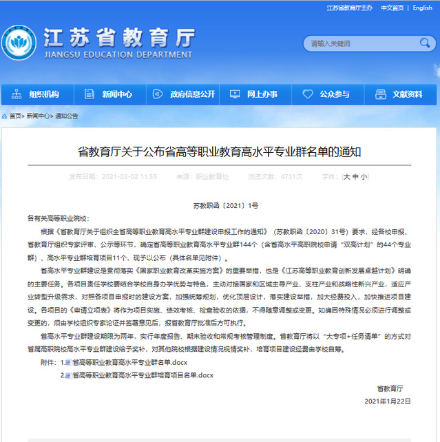 2021年1月22日,根据《省教育厅关于组织全省高等职业教育高水平专业群建设申报工作的通知》(苏教职函〔2020〕31号)要求,经学院申报、省教育厅组织专家评审、公示等环节,物流管理专业群顺利入选江苏省高等职业教育高水平专业群建设项目。