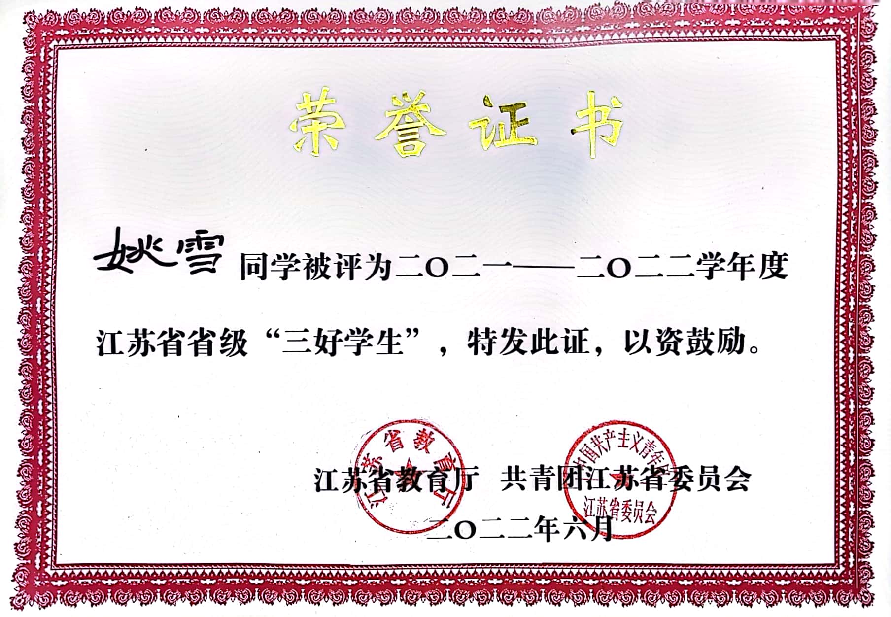 城轨191班姚雪同学获2021—2022年度江苏省省级“三好学生”