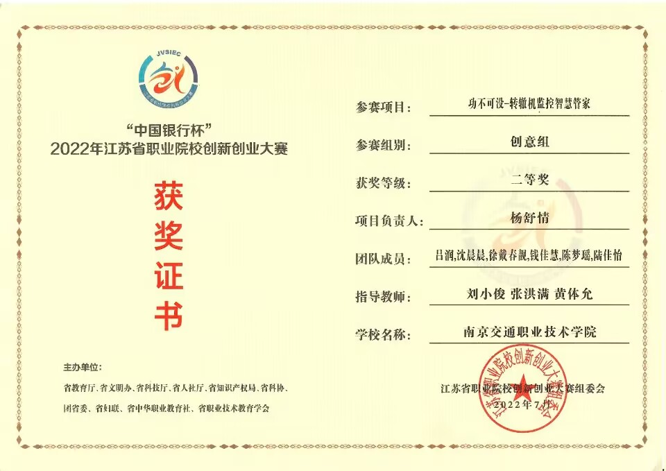 “中国银行杯”2022年江苏省职业院校创新创业大赛参赛项目“功不可没—转辙机监控智慧管家”获创意组二等奖