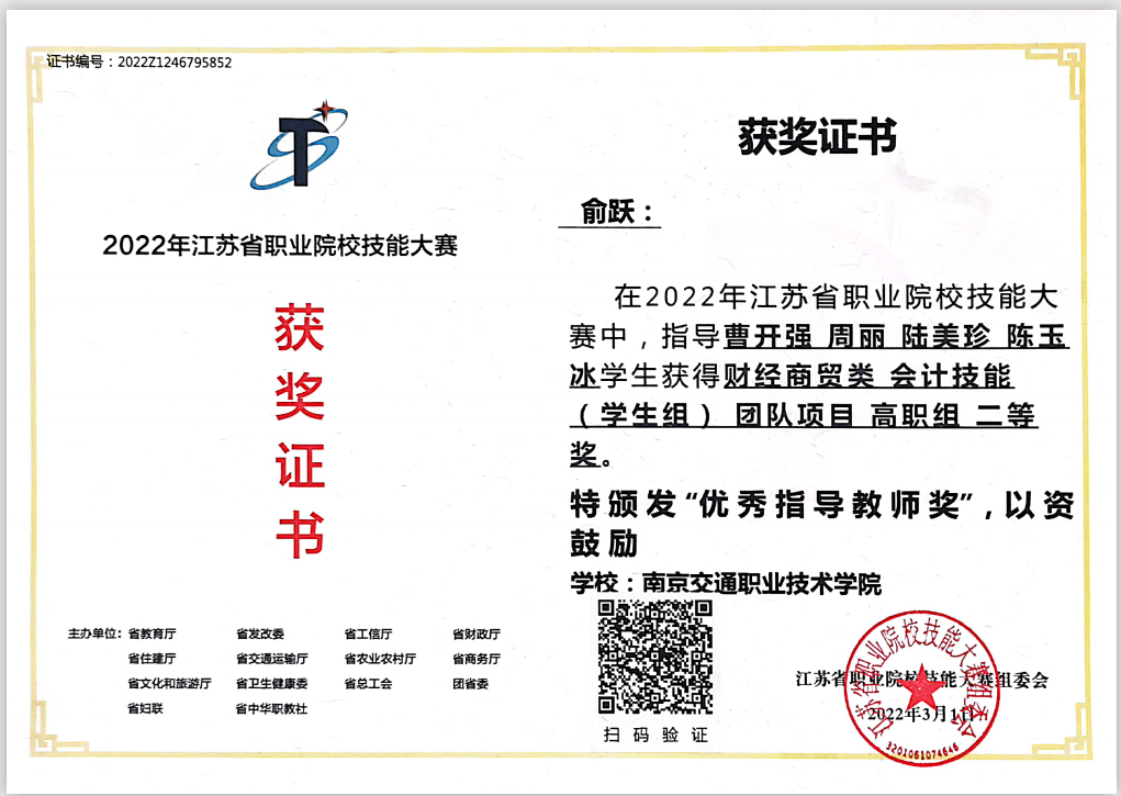 2022年,我院曹开强、周丽、陆美珍、陈玉冰四位同学代表学校参加江苏省职业院校技能大赛 “会计技能(学生组)”项目获高职组二等奖。指导教师:俞跃 朱淑贞