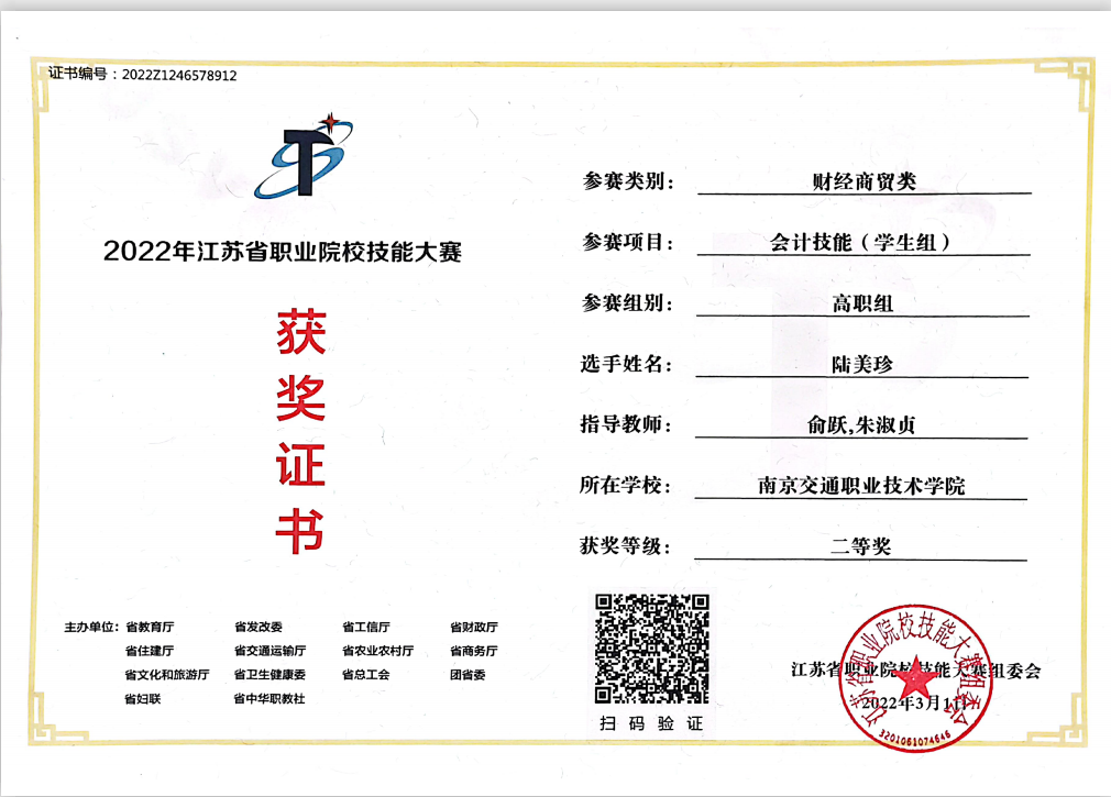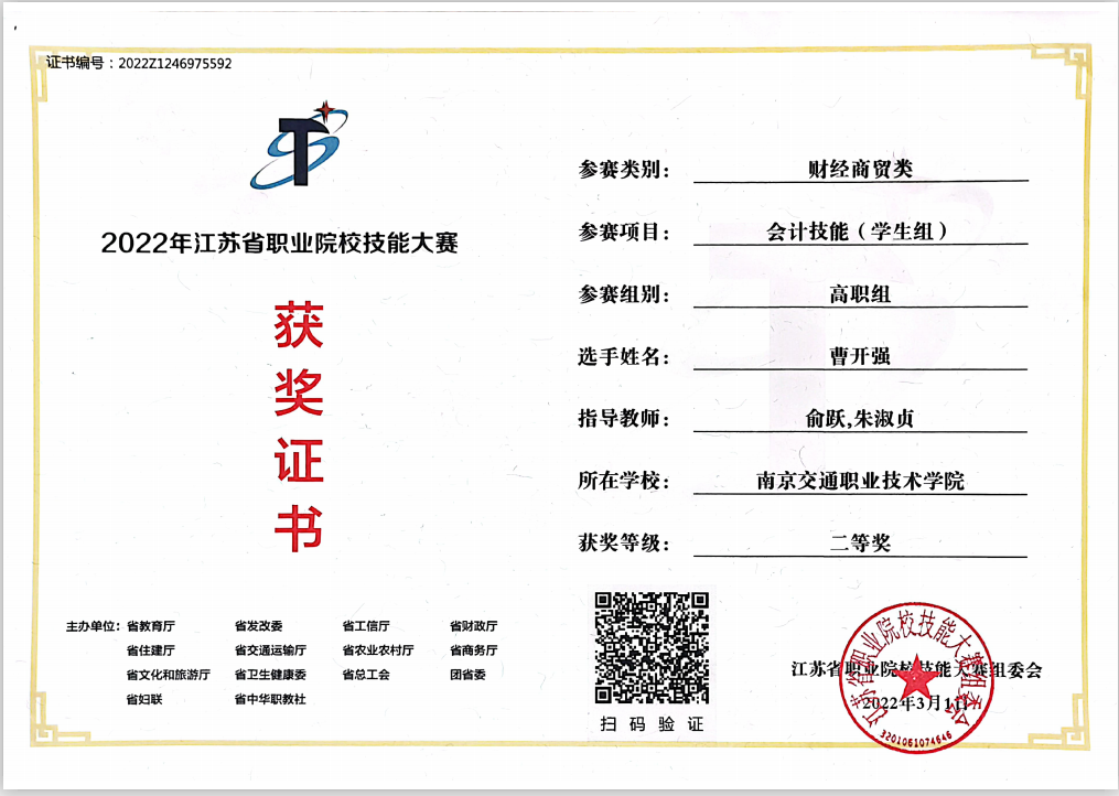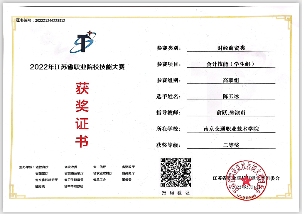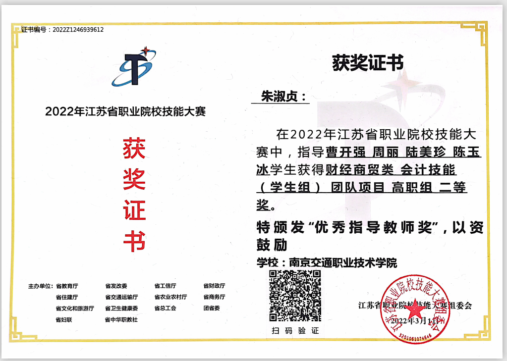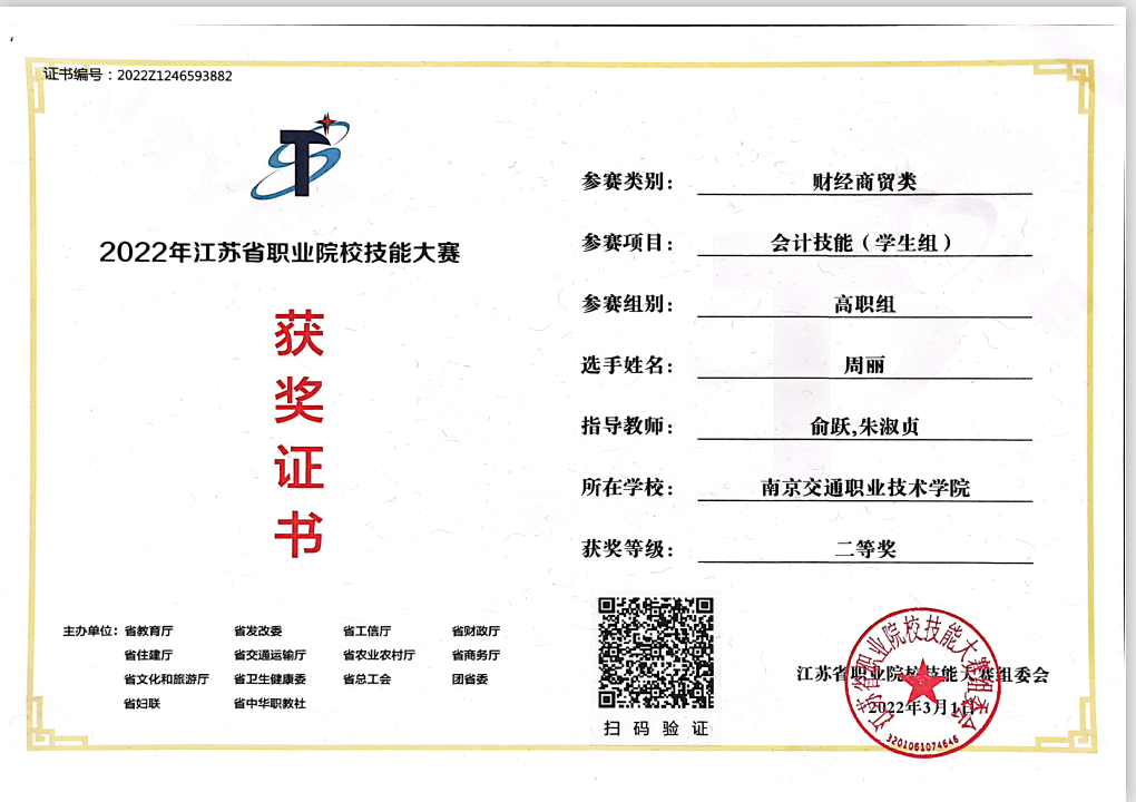 2022年江苏省职业院校技能大赛参赛项目 “会计技能(学生组)”获高职组二等奖