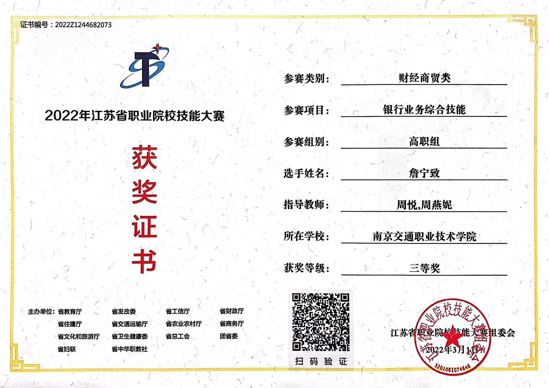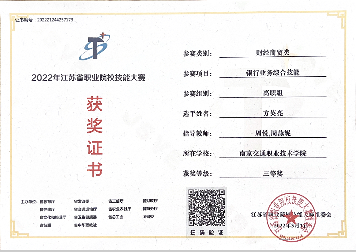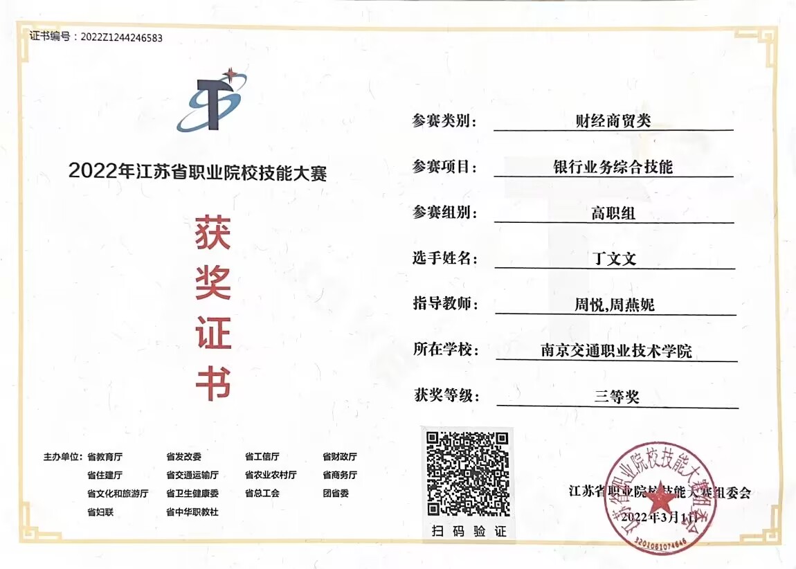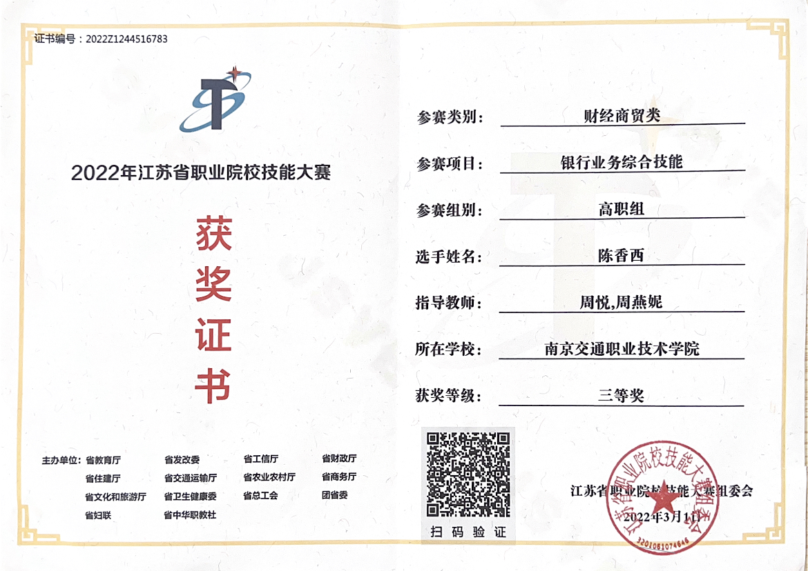 2022年江苏省职业院校技能大赛参赛项目 “银行业务综合技能”获高职组三等奖