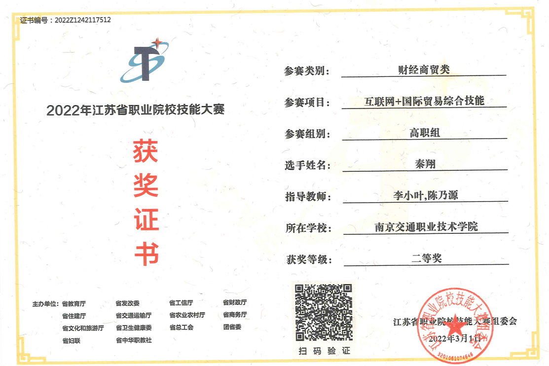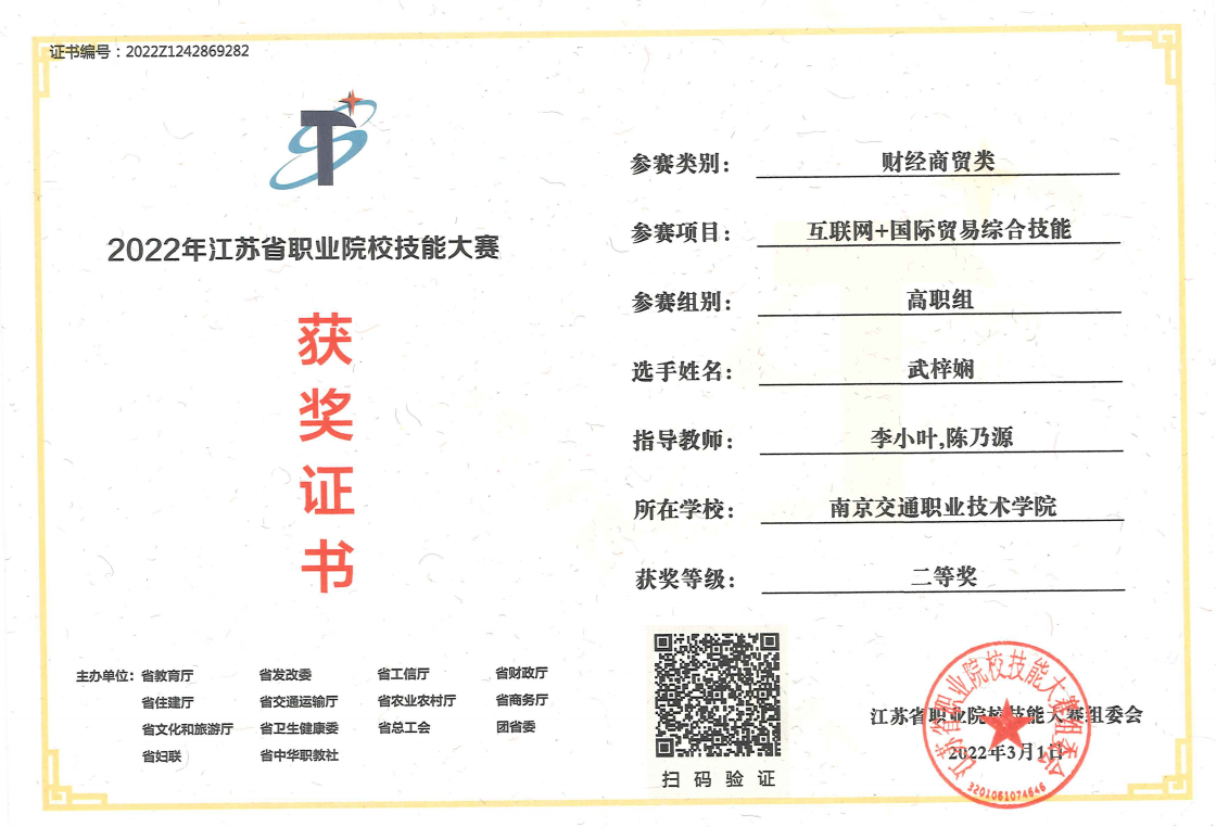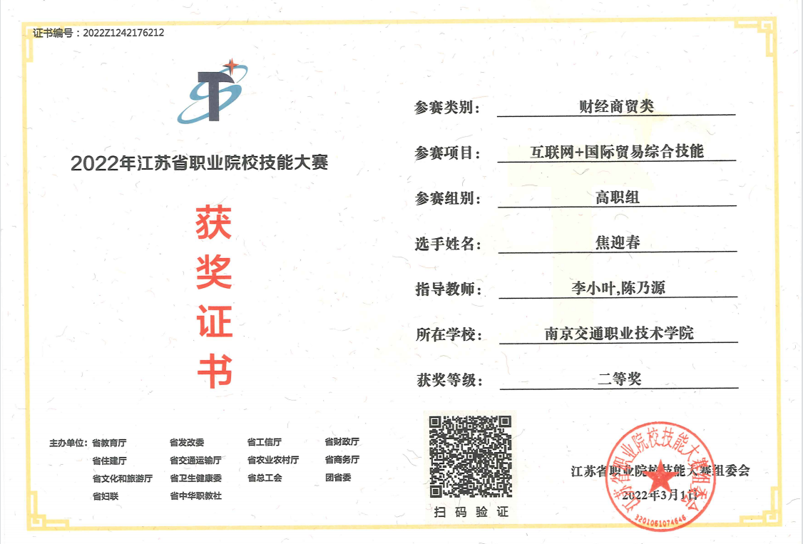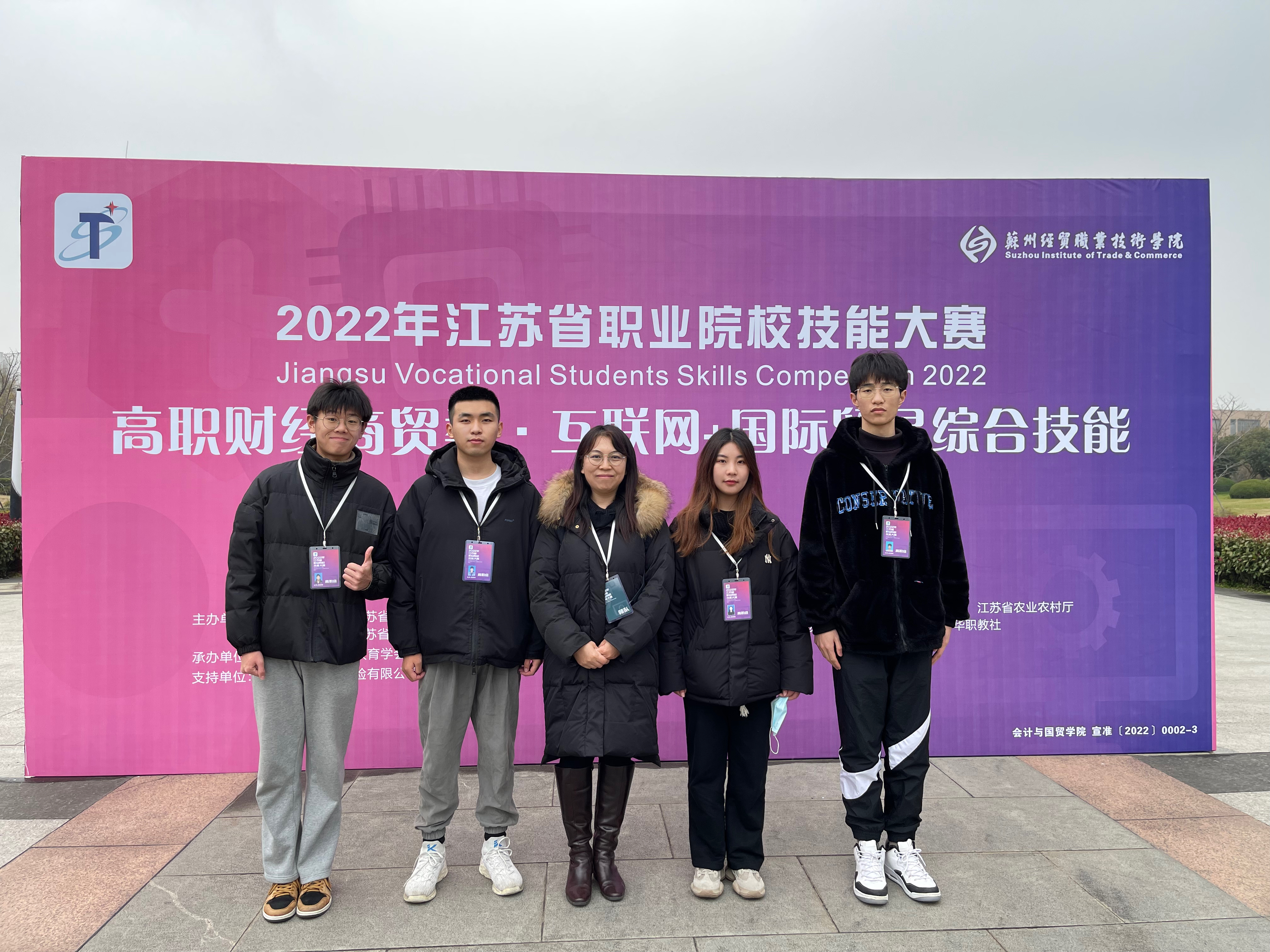 2022年3月,学院焦迎春、陆戗、秦翔、武梓娴四位同学代表学校参加江苏省职业院校技能大赛参赛 “互联网+国际贸易综合技能”项目获二等奖。指导教师:李小叶 陈乃源