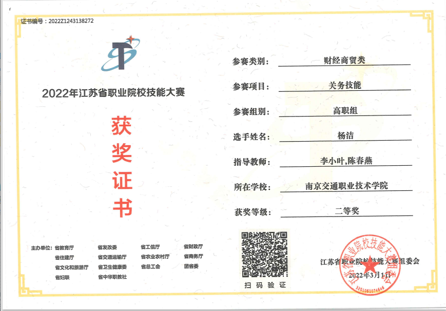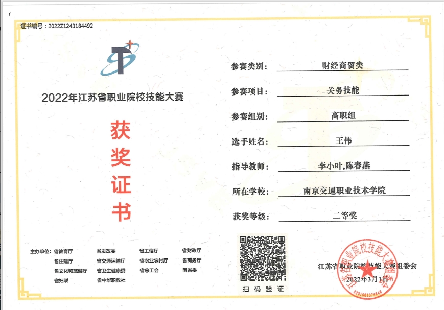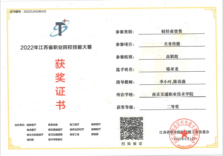 2022年江苏省职业院校技能大赛参赛项目 “关务技能”获高职组二等奖