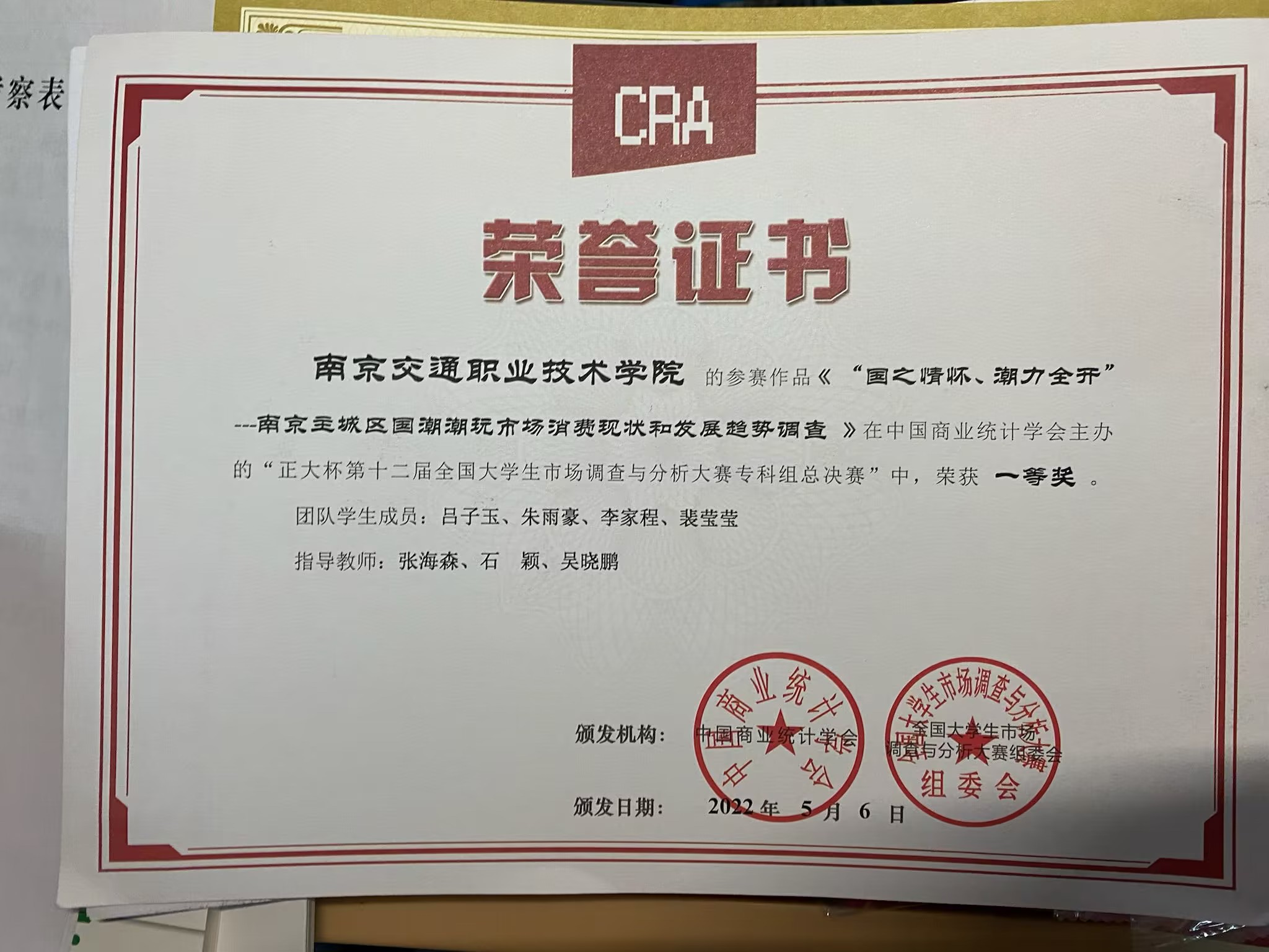 “正大杯第十二届全国大学生市场调查与分析大赛 专科组总决赛”获一等奖