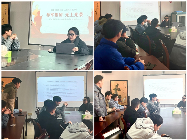 为深入贯彻习近平强军思想,进一步落实国家相关征兵工作要求,帮助学生全面了解征兵政策,激发学生应征入伍豪情,运输管理学院于12月9日下午在齐贤楼420会议室举办了2023年春季征兵宣传答疑会。会议通过线下宣讲和线上直播的形式对各个年级有意向入伍的大学生开展,全程共有150多名学生参加,会议由陈鑫明老师主持。