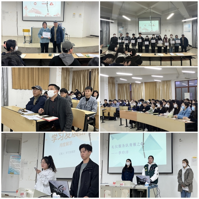 学生会负责人汇报总结了近期工作,并对接下来的工作安排进行了说明;学生会各部门负责人也一一上台,阐明了下一步的工作打算和具体安排。各部门获得月度“青雁之星”的同学跟与会人员分享了取得的成绩和工作心得。参加活动的两位老师分别为获得“青雁之星”的同学和“青雁月度部门”的代表颁发了奖状。