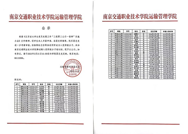 南京交通职业技术学院第42期入党积极分子培训班公示