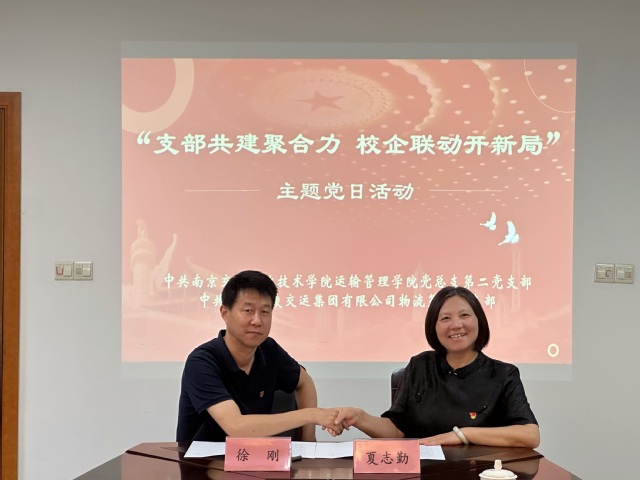 本次党日活动是由运输管理学院党总支第二党支部、中共江苏金陵交运集团有限公司物流第一党支部在充分调研的基础上,经过友好协商,决定开展的一项支部共建活动。党支部共建签约仪式上,江苏金陵交运集团有限公司物流第一党支部书记徐刚、运输管理学院党总支第二党支部书记夏志勤分别介绍了各自系统和单位的党建工作特色。徐刚书记对公司的发展历程、主要经营业务、用人需求等方面进行了详细介绍,夏志勤书记对样板党支部建设工作、基层党组织“书记项目”进行了介绍。两个支部在相互研讨中增进了解、拓宽思路、提升水平、促进合作。