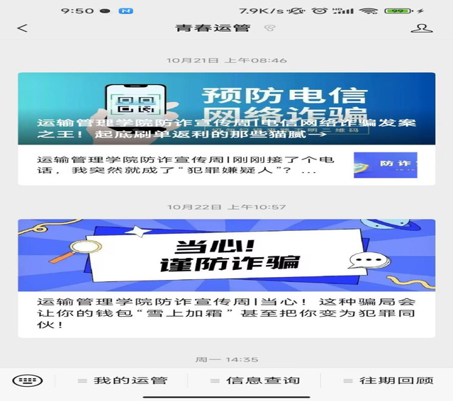 学院利用教学楼大屏播放防诈视频,在“青春运管”微信公众号上推送防诈宣传系列推文,进一步提高学院所有同学的安全防范意识和防诈能力。