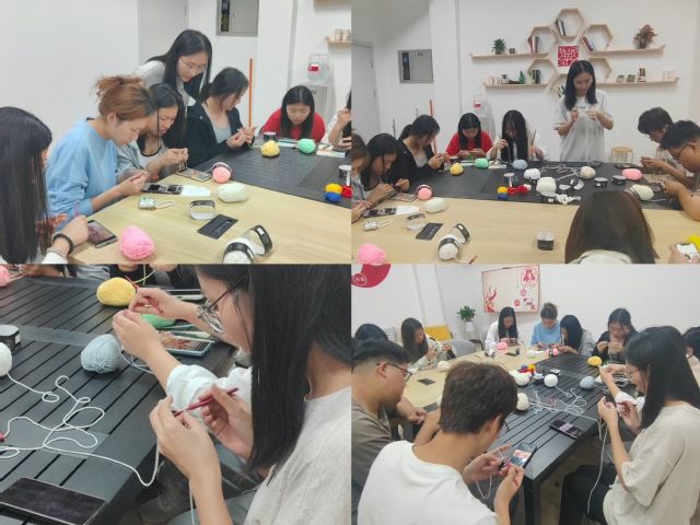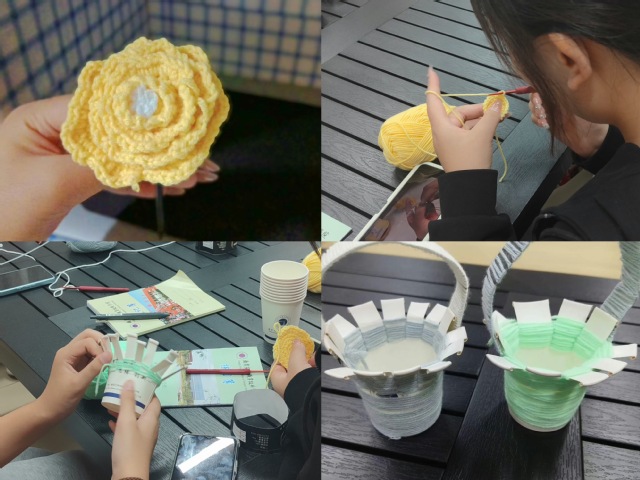 同学们大都是第一次拿起钩针,编织的动作并不熟练,常常出现落针、忘针现象,龙敏同学悉心指导,手把手教学,并与大家一起交流编织心得。钩针在同学们手中由慢变快地翻飞,各色毛线团逐渐减少,不一会的功夫一朵朵精美的小花篮展现在大家手中,每位同学脸上都洋溢着满满的成就感,体验到前所未有的惊喜与快乐。