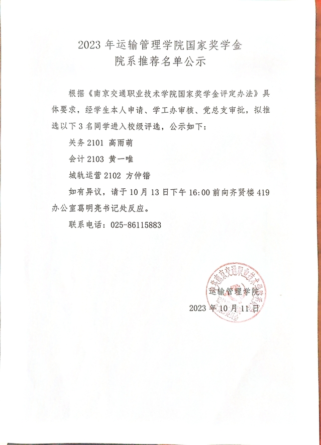2023年运输管理学院国家奖学金院系推荐名单公示