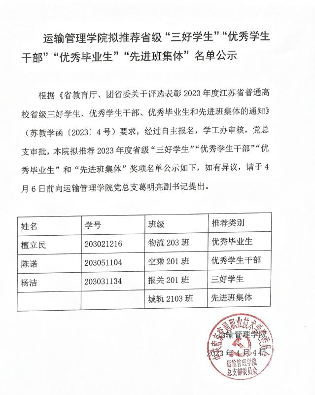 运输管理学院拟推荐省级“三好学生”“优秀学生干部”“优秀毕业生”“先进班集体”名单公示