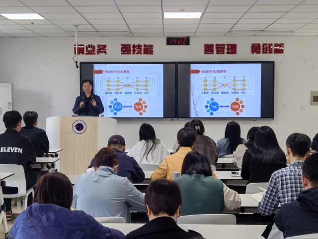 在喜迎建校70周年之际,我院在全院师生中营造良好学术氛围,学习掌握数智时代物流领域前沿技术的应用。11月8日下午,学院邀请原东南大学黄卫副教授,在齐贤楼412教室,为学院70余名师生,作了题为“数智时代供应链物流科技创新”的学术报告。
