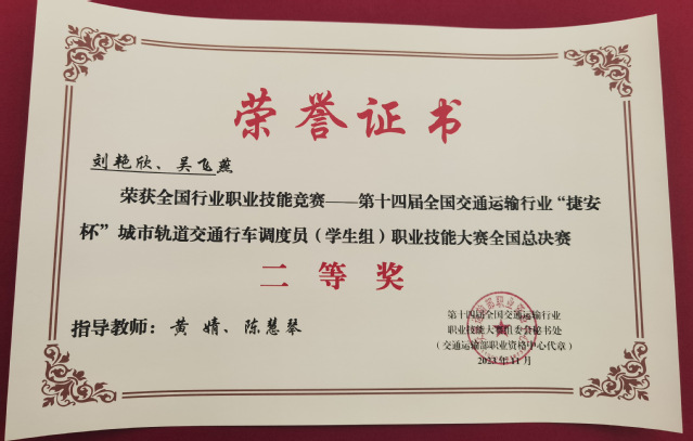 11月11日—11月16日,由交通运输部、人社部、中华总工会、共青团中央等四部委联合主办的全国一类大赛——第十四届全国交通运输行业“大象科技杯”城市轨道交通行车调度员(职工组)、“捷安杯”城市轨道交通行车调度员(学生组)职业技能大赛总决赛在山东省济南市雪野湖国际会议中心举办。经过激烈角逐,运输管理学院刘艳欣、吴飞燕两位同学(指导教师:黄婧、陈慧琴),凭借准确的判断和分析、扎实的技能功底,最终获得学生组二等奖的好成绩。