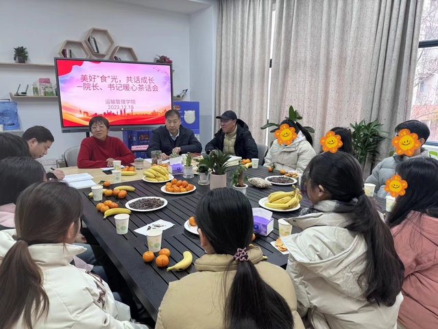 为把党和国家对家庭经济困难学生的关心关怀落实落细,进一步做好精准资助工作,让家庭经济困难学生安心就学,度过一个温暖、愉悦的冬天,运输管理学院于12月15日下午在一站式学生社区“半亩方塘”工作站开展美好“食”光,共话成长—院长、书记暖心茶话会活动。南京交通职业技术学院副院长、运输管理学院院长姜军、运输管理学院党总支书记王艳梅、党总支副书记葛明亮、辅导员肖威及家庭经济困难学生代表参加了此次活动。