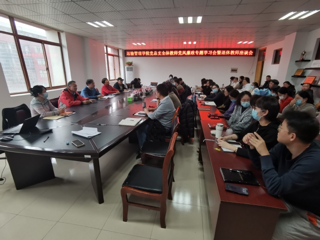 为深入学习贯彻习近平新时代中国特色社会主义思想,推动全面从严治党向纵深发展,1月17日下午,我院于齐贤楼420会议室召开全体教师党风廉政专题学习会暨退休教师座谈会。学院副院长姜军、运输管理学院党政领导及全体教师参会,会议由党总支书记王艳梅主持。