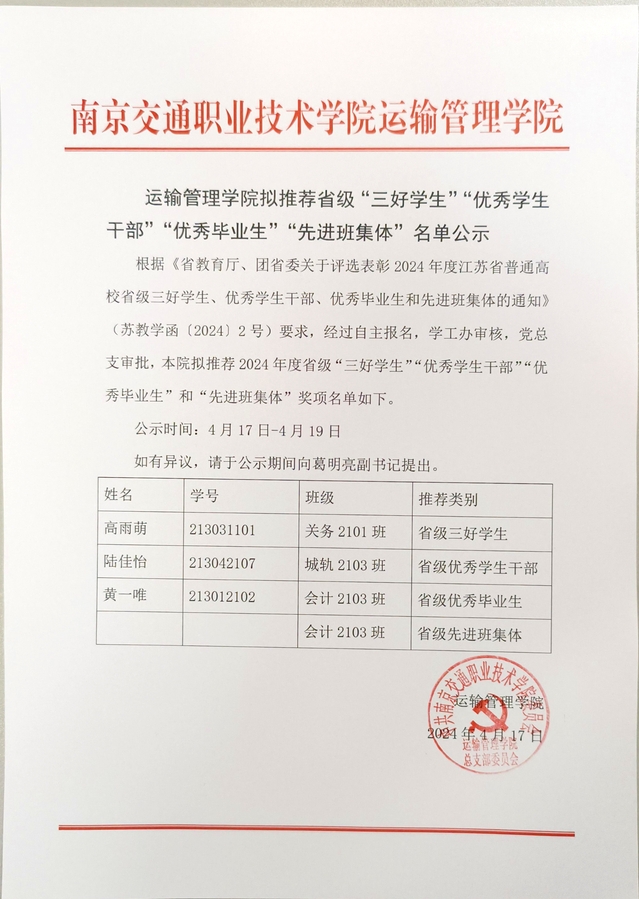 运输管理学院拟推荐省级“三好学生“”优秀学生干部”“先进班集体”名单公示