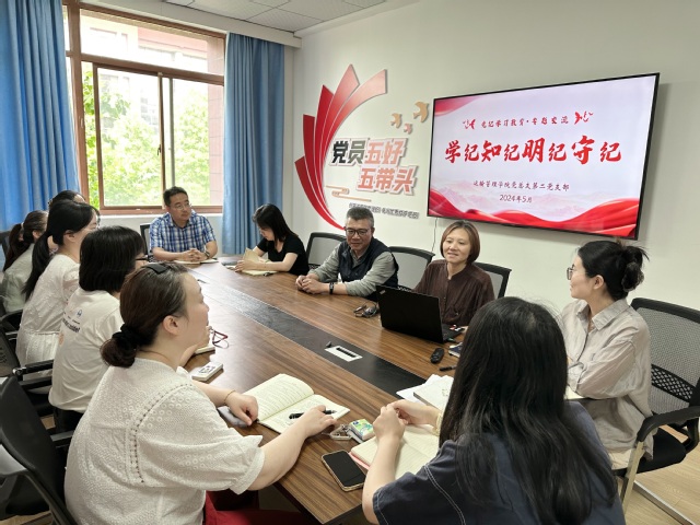 5月22日下午,运输管理学院党总支第二党支部开展了以“学纪知纪明纪守纪”为题的党纪学习教育党课,由党支部书记夏志勤同志主讲,全体党员教师参加。