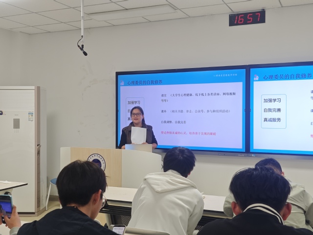 运输管理学院青雁心理工作室姬慧老师从心理委员的选聘条件、工作职责、工作原则和方法、自我能力提升等几个方面进行了讲解,并用多个案例向同学们详细讲解了作为心理委员应在日常生活中如何辨识同学们的身心健康问题,如何为同学们提供力所能及的支持和帮助,如何组织开展心理主题教育活动等。培训中,姬老师对接下来的新生心理普测工作和本学期的重点工作也进行了指导和布置。