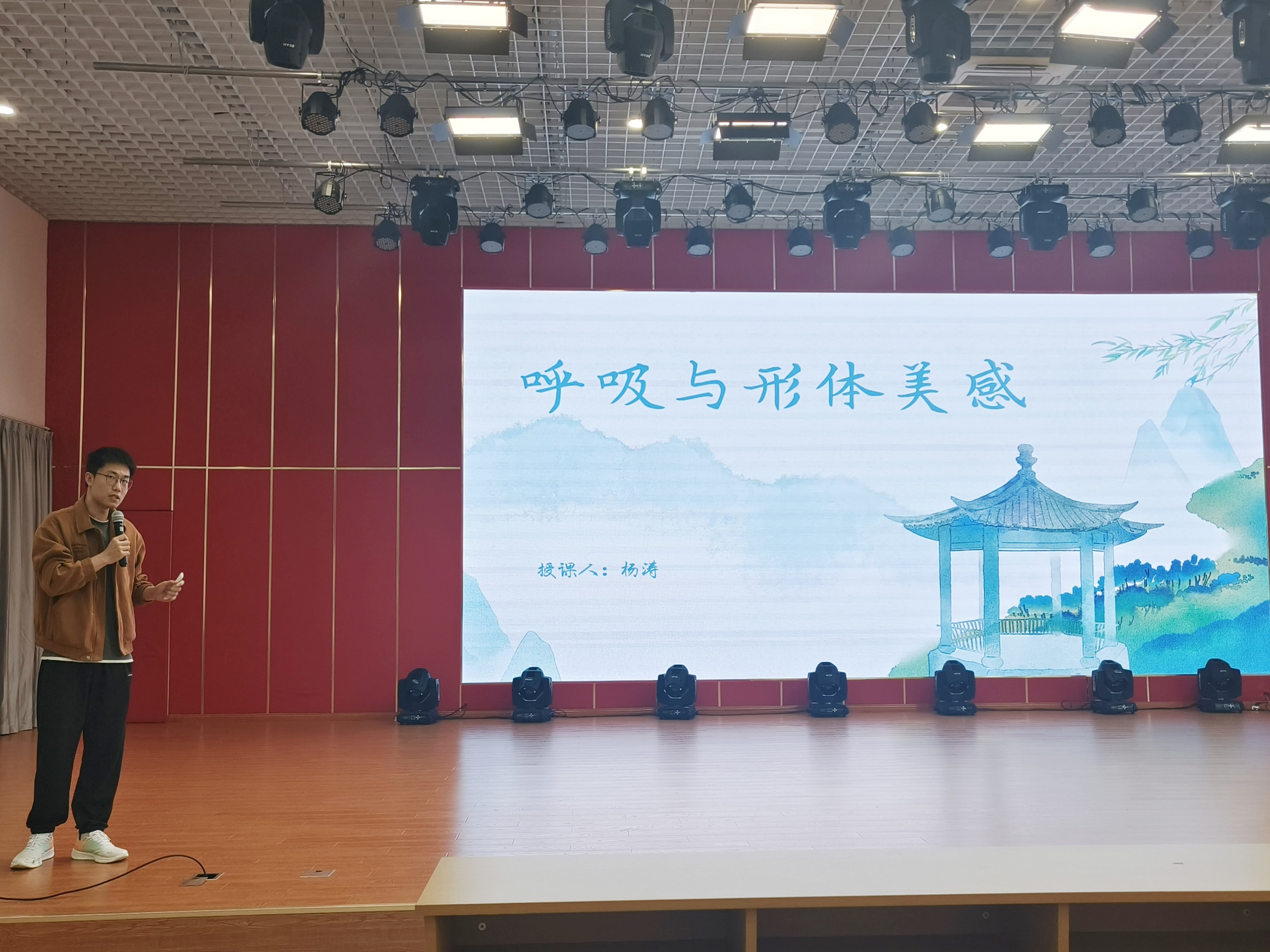 杨涛老师以“呼吸与形体美感”为主题对在场同学进行了“呼吸与身体能量”“呼吸与形体美感”“呼吸与形体塑造”“身心合一”这四个方面的培训,通过体验练习与理论讲解,深刻剖析了日常生活中呼吸与形体美感之间的关系,引导同学们深入思考自身形体美感的塑造方向。