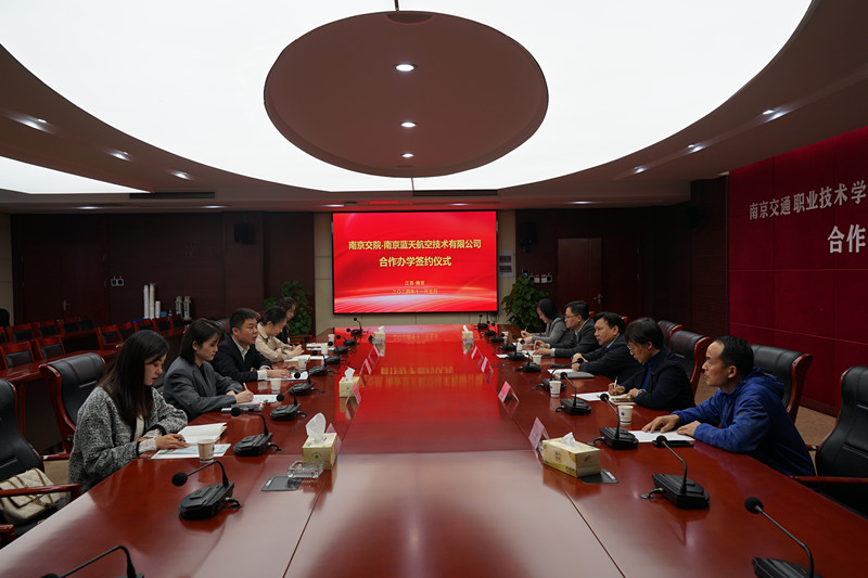 2024年11月5日,南京交通职业技术学院与南京蓝天航空技术有限公司在学院签订合作办学协议,南京交通职业技术学院院长王道峰,南京蓝天航空技术有限公司董事长兼总经理朱正华,学院科技处、运输管理学院及蓝天公司相关业务部门负责人共同参加。