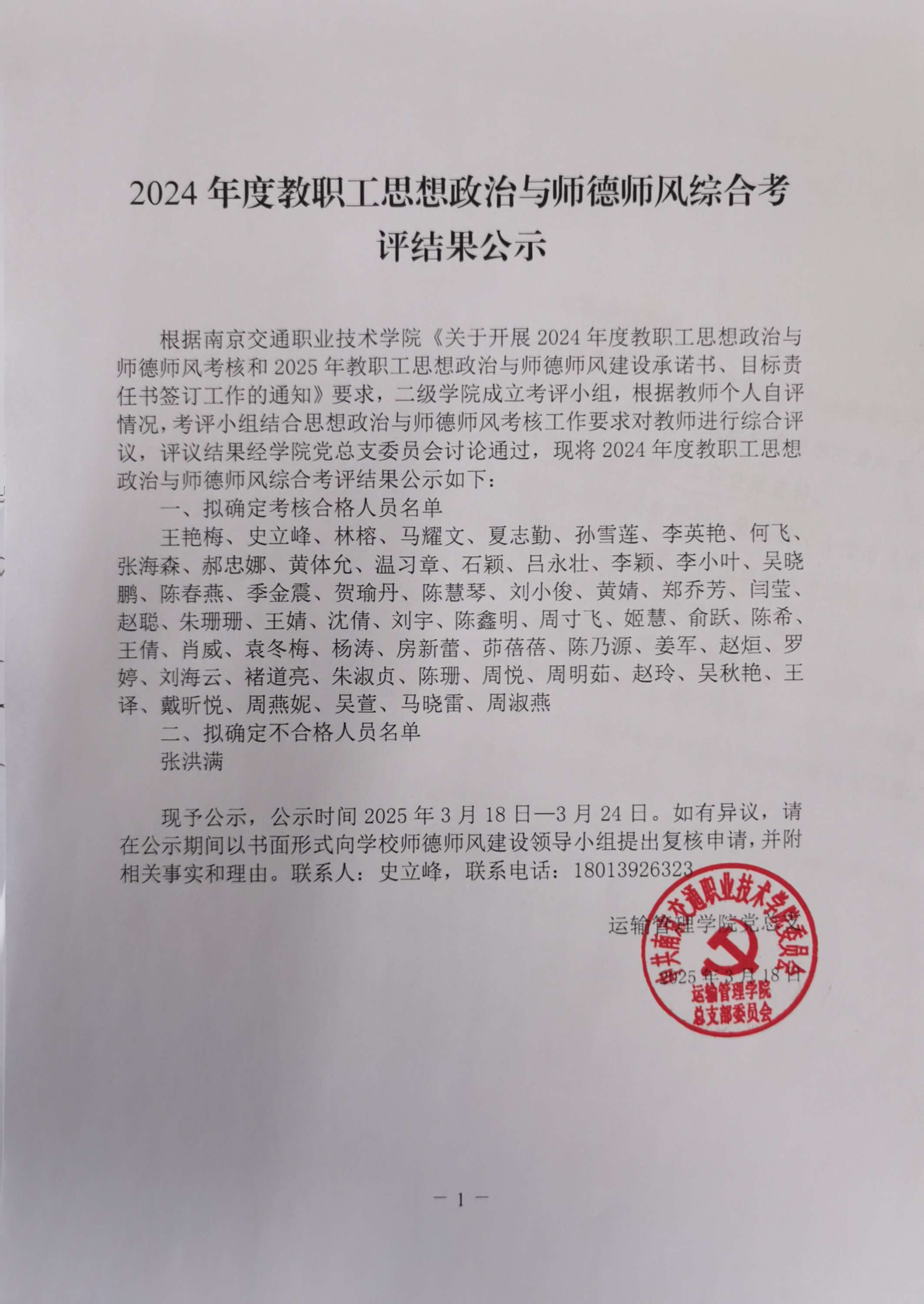 2024年度教职工思想政治与师德师风综合考评结果公示