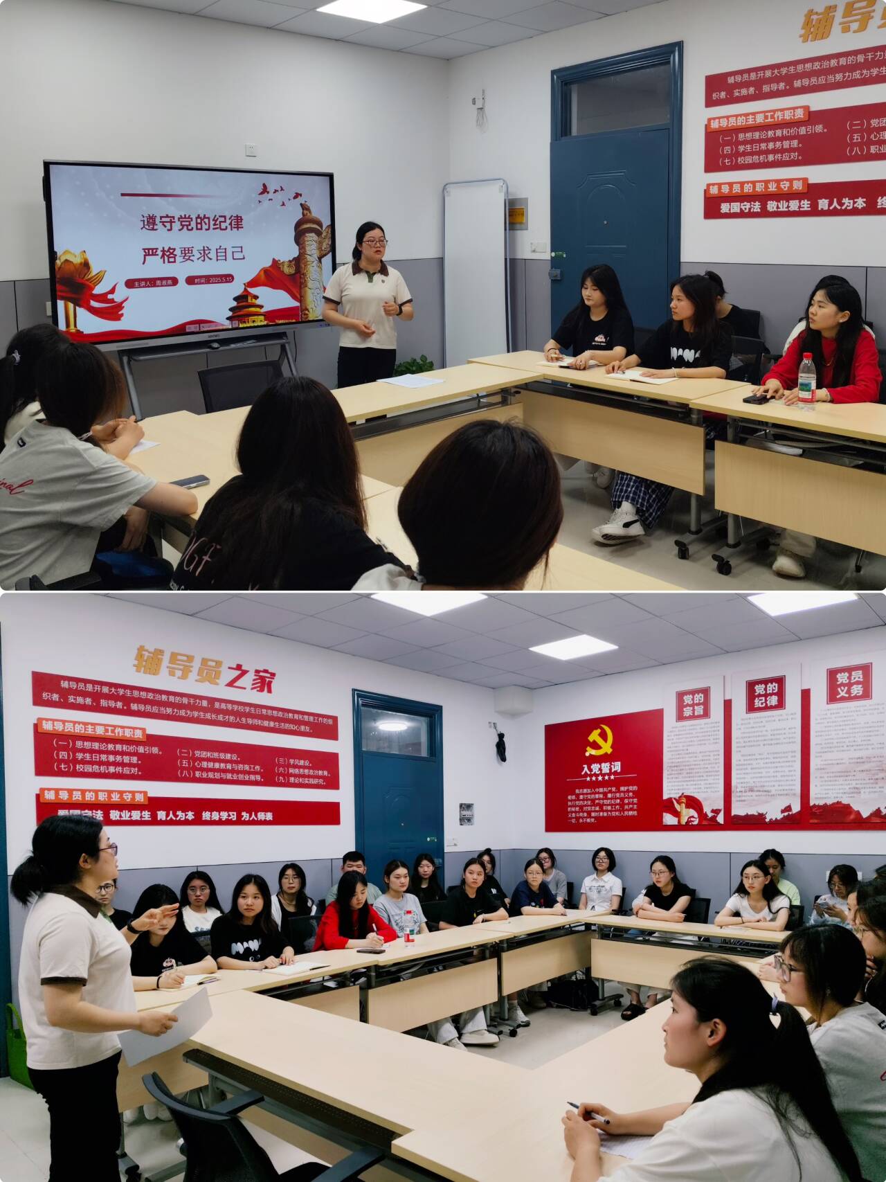 周淑燕老师以“遵守党的纪律,严格要求自己”为主题,从党的纪律性的重要性、党的纪律的主要内容、加强党纪监督和如何严守党的纪律的主要内容等四个方面为同学做了详细的解释,接着,通过引入案例教育同学们要从廉洁纪律、群众纪律、工作纪律和生活纪律等方面严格要求自己。最后,她要求同学们要学习党章党规党纪和习近平新时代中国特色社会主义思想,自觉遵守纪律、接受党组织和群众监督。