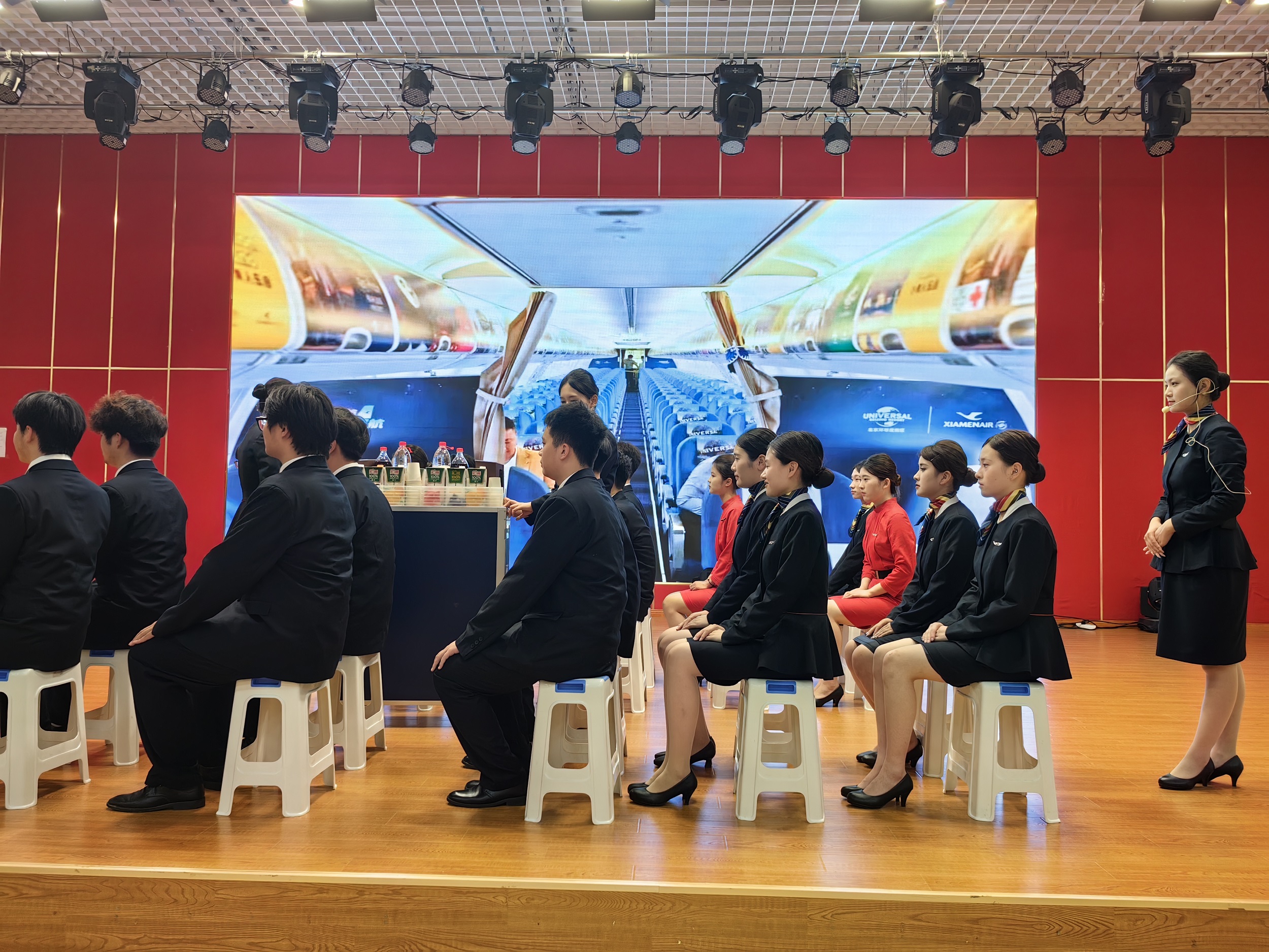 随后的汇报演出内容精彩纷呈,从优雅的民航礼仪风采展示到标准的客舱服务流程展示;从激昂的歌声到严谨的客舱安全规范,全方位展现了空中乘务专业学子的卓越风采。