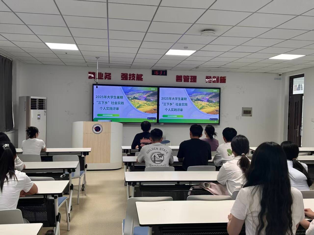 分享会上,17名学生代表登台,结合PPT生动讲述了自己的暑期实践经历。从分享中,能真切体会到“被需要是一种幸福”。有的同学回顾了自己在社区报到、开展夏令营的精彩时光;有的同学分享了自己走访村委会并介绍学校资助政策的经历;有的同学重温了自己做兼职时被顾客赞赏的骄傲时刻。大学生暑期社会实践意义深远,它让学生在学业之外,搭建起自身与社会的桥梁,既能锻炼实践能力、涵养家国情怀,也能深入了解美丽乡村建设,实现个人成长与社会认知的双重提升。
