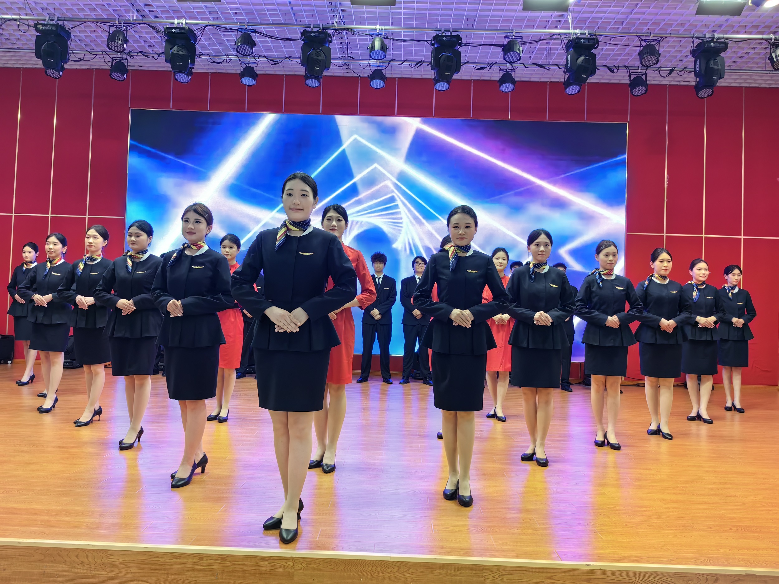 随后的汇报演出内容精彩纷呈,从优雅的民航礼仪风采展示到标准的客舱服务流程展示;从激昂的歌声到严谨的客舱安全规范,全方位展现了空中乘务专业学子的卓越风采。
